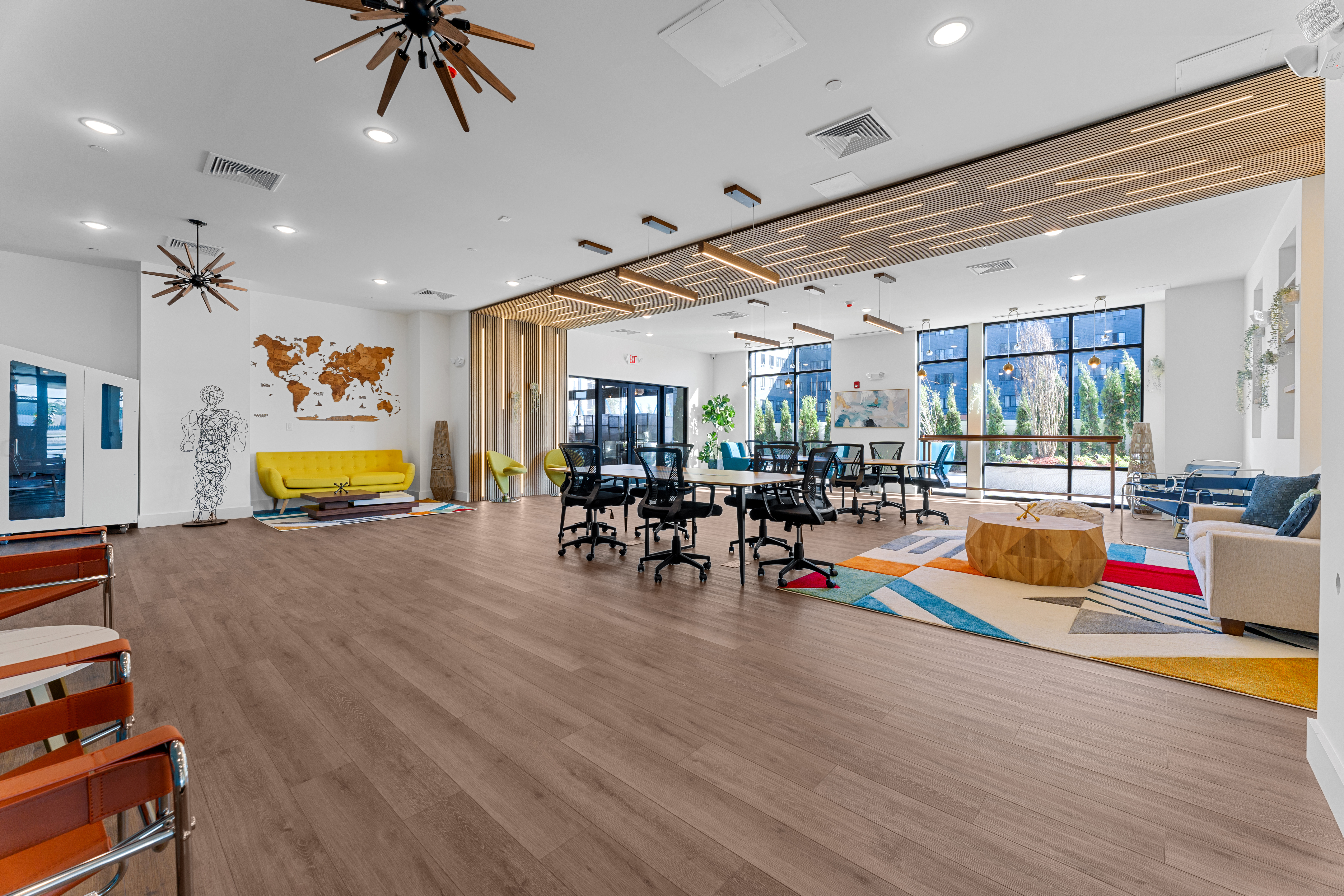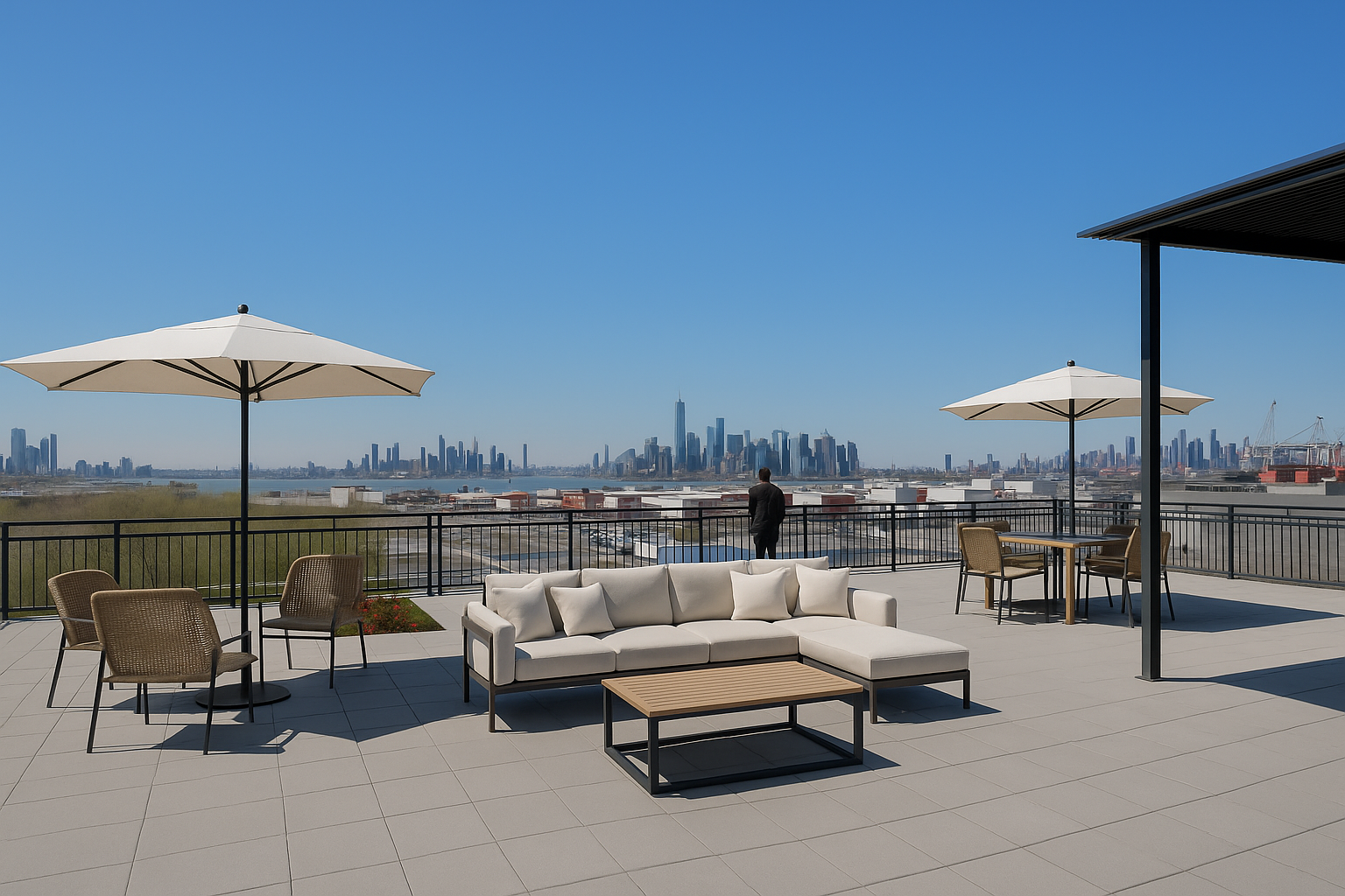 Thoughtfully designed with a full-service wet bar, plush lounge seating, and shaded daybeds, the rooftop invites day-to-night relaxation and celebration. With space for up to 300 guests, it easily transforms into a stunning venue for private events, social gatherings, or community occasions—all set against one of New Jersey’s most iconic backdrops.