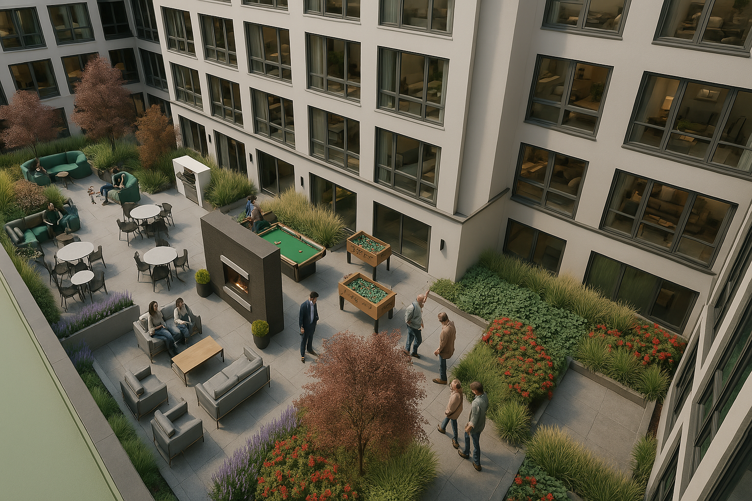 Designed with wellness and community in mind, the deck features lush greenery, cozy lounge seating, social firepit nooks, and entertainment-ready spaces. For health enthusiasts, a dedicated yoga corner offers the perfect setting to stretch, breathe, and move in the open air—all while enjoying the comfort of privacy. Direct access to the fitness center makes it effortless to transition between indoor workouts and revitalizing outdoor flows, creating a holistic wellness experience unlike any other.